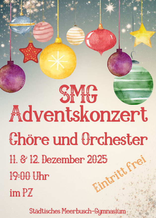 Am 11. und 12. Dezember findet jeweils um 19 Uhr abends im PZ der Schule das traditionelle Adventskonzert des Städtischen Meerbusch-Gymnasiums statt. Die Chöre sowie das Orchester des SMGs präsentieren Musik und Texte zum Advent und zur Weihnacht. Der Abend bietet ein abwechslungsreiches Programm und zudem die Möglichkeit, in der hektischen Vorweihnachtszeit einige ruhigere Momente genießen zu können.